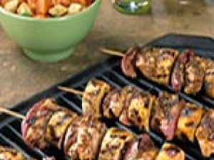 A wooden Skewer a generous serving of tender chicken breast chunks marinated in a brown sugar and honey BBQ sauce. A grill and that all you need.